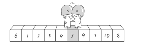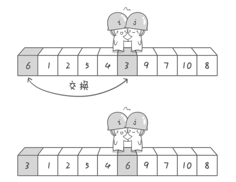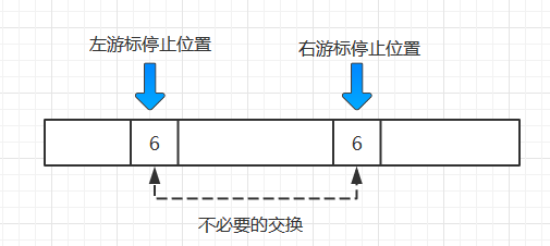 - 左游标向右扫描, 跨过所有小于基准元素的数组元素, 直到遇到一个大于或等于基准元素的数组元素, 在那个位置停下。