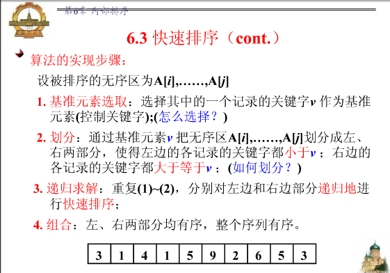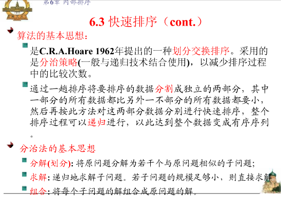 if(a[low]>a[high]) { exchange(a, low, high); //此时有 a[low] < a[high] } if(a[middle]>a[high]){ exchange(a, middle, high); //此时有 a[low], a[middle] < a[high] } if(a[middle]>a[low]) { exchange(a, middle, low); //此时有a[middle]< a[low] < a[high] } return a[low]; // a[low]的值已经被换成三数中的中位数, 将其返回 } private static int partition (int[] a, int low, int high) { int i = low, j = high+1; // i, j为左右扫描指针 PS: 思考下为什么j比i 多加一个1呢? int pivotkey = selectMiddleOfThree( a, low, high); while(true) { while (a[--j]>pivotkey) { if(j == low) break; } // 右游标左移 while(a[++i]<pivotkey) { if(i == high) break; } // 左游标右移 if(i>=j) break; // 左右游标相遇时候停止, 所以跳出外部while循环 else exchange(a,i, j) ; // 左右游标未相遇时停止, 交换各自所指元素,循环继续 } exchange(a, low, j); // 基准元素和游标相遇时所指元素交换,为最后一次交换 return j; // 一趟排序完成, 返回基准元素位置 } private static void sort (int [] a, int low, int high) { if(high<= low) { return; } // 当high == low, 此时已是单元素子数组,自然有序, 故终止递归 int j = partition(a, low, high); // 调用partition进行切分 sort(a, low, j-1); // 对上一轮排序(切分)时,基准元素左边的子数组进行递归 sort(a, j+1, high); // 对上一轮排序(切分)时,基准元素右边的子数组进行递归 } public static void sort (int [] a){ //sort函数重载, 只向外暴露一个数组参数 sort(a, 0, a.length - 1); } }