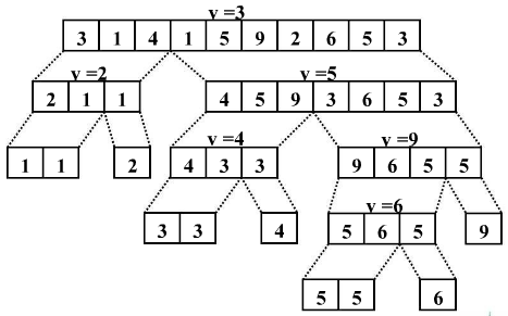 - 通过递归的处理, 再对原数组分割的两部分分别划分为两部分,同样是使得其中一部分的所有数据都小于另一部分的所有数据。 这个时候原数组被划分为了4份