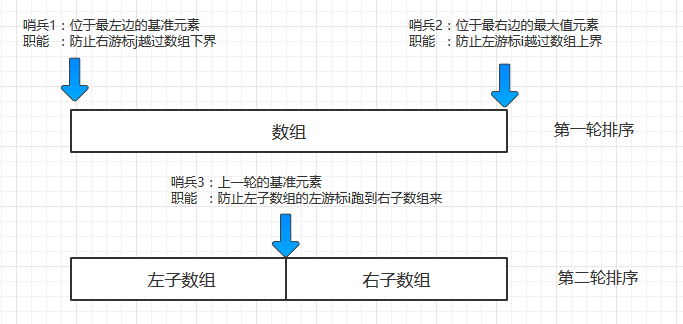 - 基准元素:它是将数组划分为两个子数组的过程中, 用于界定大小的值, 以它为判断标准, 将小于它的数组元素“划分”到一个“小数值数组”里, 而将大于它的数组元素“划分”到一个“大数值数组”里面。这样,我们就将数组分割为两个子数组, 而其中一个子数组里的元素恒小于另一个子数组里的元素