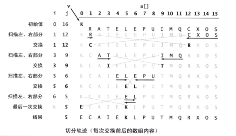 private static int getRandom (int []a, int low, int high) { int RdIndex = (int) (low + Math.random()* (high - low)); // 随机取出其中一个数组元素的下标 exchange(a, RdIndex, low); // 将其和最左边的元素互换 return a[low]; } private static int partition (int[] a, int low, int high) { int i = low, j = high+1; // i, j为左右扫描指针 PS: 思考下为什么j比i 多加一个1呢? int pivotkey = getRandom (a, low, high); // 基准元素随机化 while(true) { while (a[--j]>pivotkey) { if(j == low) break; } // 右游标左移 while(a[++i]<pivotkey) { if(i == high) break; } // 左游标右移 if(i>=j) break; // 左右游标相遇时候停止, 所以跳出外部while循环 else exchange(a,i, j) ; // 左右游标未相遇时停止, 交换各自所指元素,循环继续 } exchange(a, low, j); // 基准元素和游标相遇时所指元素交换,为最后一次交换 return j; // 一趟排序完成, 返回基准元素位置 }