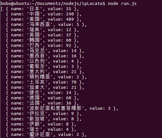 21 }); 22 23 function countArr(arr){ 24 var o = {}; 25 for(var i = 0, l = arr.length; i < l; i++){ 26 var key = arr[i]; 27 if(!o[key]){ 28 o[key] = 1; 29 } else { 30 o[key]++; 31 } 32 } 33 return o; 34 } 35 /* 异步方法 支持域名 */ 36 //IP.find('116.226.54.188', function(data){ 37 // console.log(data); 38 //}); 39 40 /* 同步方法,不支持域名,仅支持IPv4 */ 41 //console.log(IP.findSync('180.73.134.23'));