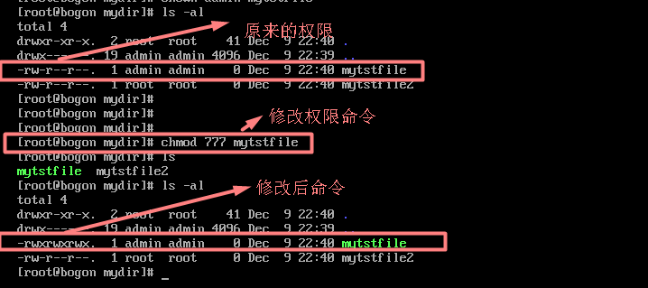 1 ##原来的文件权限 2 [admin@bogon mydir]$ ls -al 3 -rwxrwxrwx. 1 admin admin 0 12月 9 22:40 mytstfile 4 5 ##修改命令 6 [admin@bogon mydir]$ chmod u=rw,g=rx,o=r mytstfile 7 8 ##修改后的权限 9 [admin@bogon mydir]$ ls -al 10 总用量 4 11 -rw-r-xr--. 1 admin admin 0 12月 9 22:40 mytstfile