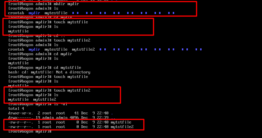 为了更好的演示这三个命令,我们先来看一下另外一个命令:touch(新建文件,用法:touch [fileName]),mkdir (新建目录,用法:mkdir [fileName])。我们在 admin 账号主文件夹下创建一个 mydir 目录。然后在这个文件里面创建 两个文件:mytstfile、mytstfile2,创建好的目录和文件如下图: