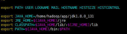 [root@sf jdk1.8.0_131]# pwd /home/hadoop/app/jdk1.8.0_131 [root@sf jdk1.8.0_131]# vim /etc/profile ## /etc/profile里面添加的内容 export JAVA_HOME=/home/hadoop/app/jdk1.8.0_131 export JRE_HOME=${JAVA_HOME}/jre export CLASSPATH=$JAVA_HOME/lib/:${JRE_HOME}/lib export PATH=${JAVA_HOME}/bin:$PATH #光标处插入 i,保存退出 ctrl+c,:wq #执行配置文件使生效 [root@sf jdk1.8.0_131]# source /etc/profile