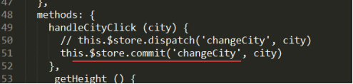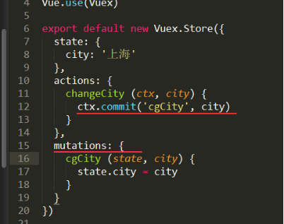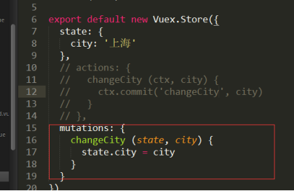 要想使用mutation就的调用commit方法,将数据传递给mutations里面的cgCity方法,他也是接收两个参数一个是state 第二个是commit传递进来的city,最后将传进来的city赋值给state的city就改变了整个数据的city