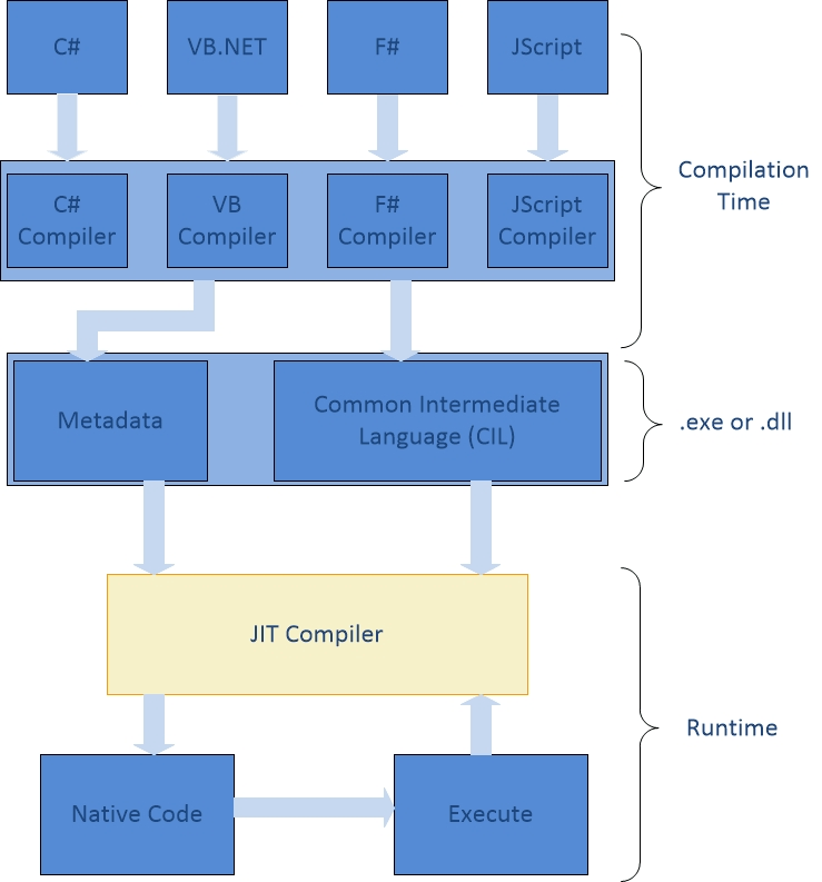 IL 运行时, JIT(Just-In-Time) Compiler 编译IL代码, 创建特定于平台的本地代码.