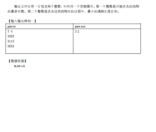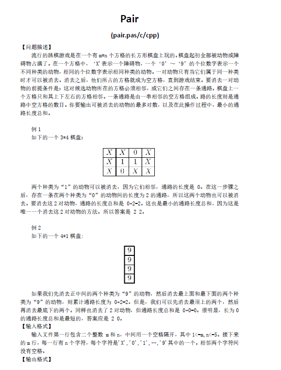 # include <bits/stdc++.h> # define Rint register int using namespace std; const int MAXN=7; const int dx[]={0,-1,0,1,0}; const int dy[]={0,0,1,0,-1}; struct node{ int M[MAXN][MAXN],L,scr;}; struct rec{ int x,y,step;}; char s[MAXN]; int mp[MAXN][MAXN],start[MAXN][MAXN],n,m; bool inq[MAXN][MAXN]; queue<rec>Q; inline bool check(Rint X1,Rint Y1,Rint X2,Rint Y2,int &d) { while(!Q.empty()) Q.pop(); memset(inq,false,sizeof(inq)); inq[X1][Y1]=true; rec st; st.step=0; st.x=X1; st.y=Y1; Q.push(st); while (!Q.empty()) { rec u=Q.front();Q.pop(); for (int i=1;i<=4;i++) { rec v; v.x=u.x+dx[i]; v.y=u.y+dy[i]; v.step=u.step+1; if (v.x==X2&&v.y==Y2) { d=v.step-1; return true;} if (v.x>n||v.x<1|v.y>m||v.y<1||inq[v.x][v.y]||mp[v.x][v.y]!=10) continue; if (v.x==X2&&v.y==Y2) { d=v.step-1; return true;} Q.push(v); inq[v.x][v.y]=true; } } return false; } queue<node>q; inline void bfs() { node st; memcpy(st.M,start,sizeof(start)); st.L=0; st.scr=0; int ans_scr=0,ans_L=0x7f7f7f7f; q.push(st); while (!q.empty()) { node u=q.front();q.pop(); for (Rint X1=1;X1<=n;X1++) for (Rint Y1=1;Y1<=m;Y1++) { if (u.M[X1][Y1]==-1||u.M[X1][Y1]==10) continue; for (Rint X2=1;X2<=n;X2++) for (Rint Y2=1;Y2<=m;Y2++) { if (X1==X2&&Y1==Y2) continue; if (u.M[X2][Y2]==-1||u.M[X2][Y2]==10) continue; if (u.M[X1][Y1]!=u.M[X2][Y2]) continue; int delt_L; memcpy(mp,u.M,sizeof(u.M)); if (check(X1,Y1,X2,Y2,delt_L)) { node v=u; memcpy(v.M,u.M,sizeof(u.M)); v.L=u.L+delt_L; v.scr=u.scr+1; v.M[X1][Y1]=v.M[X2][Y2]=10; if (v.scr>ans_scr) { ans_scr=v.scr; ans_L=v.L; } else if (v.scr==ans_scr&&v.L<ans_L) ans_L=v.L; q.push(v); } } } } if (ans_scr==0) printf("0 0\n"); else printf("%d %d\n",ans_scr,ans_L); } int main() { scanf("%d%d",&n,&m); for (Rint i=1;i<=n;i++) { cin>>s; for (Rint j=0;j<m;j++) if (s[j]>='0'&&s[j]<='9') start[i][j+1]=s[j]-'0'; else if (s[j]=='X') start[i][j+1]=-1; } bfs(); return 0; }