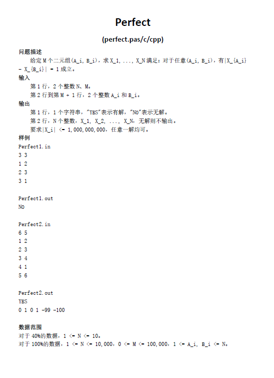 # include <bits/stdc++.h> # define Rint register int using namespace std; const int MAXN=10005,MAXM=2*100005; int head[MAXN],col[MAXN],tot=0,n,m; bool vis[MAXN],ff; struct rec{ int pre,to;}a[MAXM]; struct IOBS{ inline int read() { int X=0,w=0; char c=0; while (!(c>='0'&&c<='9')) { w|=c=='-';c=getchar();} while (c>='0'&&c<='9') { X=(X<<3)+(X<<1)+(c^48); c=getchar();} return w?-X:X; } inline void write(Rint x) { if (x<0) { x=-x; putchar('-');} if (x>9) write(x/10); putchar(x%10+'0'); } inline void write_files(Rint x,char cc){ write(x); putchar(cc);} inline void Files() { freopen("perfect.in","r",stdin); freopen("perfect.out","w",stdout);} }IO; inline void adde(Rint u,Rint v) { a[++tot].pre=head[u]; a[tot].to=v; head[u]=tot; } inline void dfs(Rint u,Rint c) { vis[u]=true; col[u]=c; for (Rint i=head[u];i;i=a[i].pre){ int v=a[i].to; if (vis[v]&&col[v]!=(!c)) { ff=false; return;} if (vis[v]&&col[v]==(!c)) continue; dfs(v,!c); } } int main() { IO.Files(); n=IO.read(); m=IO.read(); int u,v; for (Rint i=1;i<=m;i++) { u=IO.read();v=IO.read(); adde(u,v); adde(v,u); } memset(vis,false,sizeof(vis)); for (Rint i=1;i<=n;i++) { if (vis[i]) continue; ff=true; dfs(i,0); if (ff==false) { printf("NO\n"); return 0;} } putchar('Y');putchar('E');putchar('S');putchar('\n'); for (Rint i=1;i<=n;i++) if (i!=n) IO.write_files(col[i],' '); else IO.write(col[i]); putchar('\n'); return 0; }