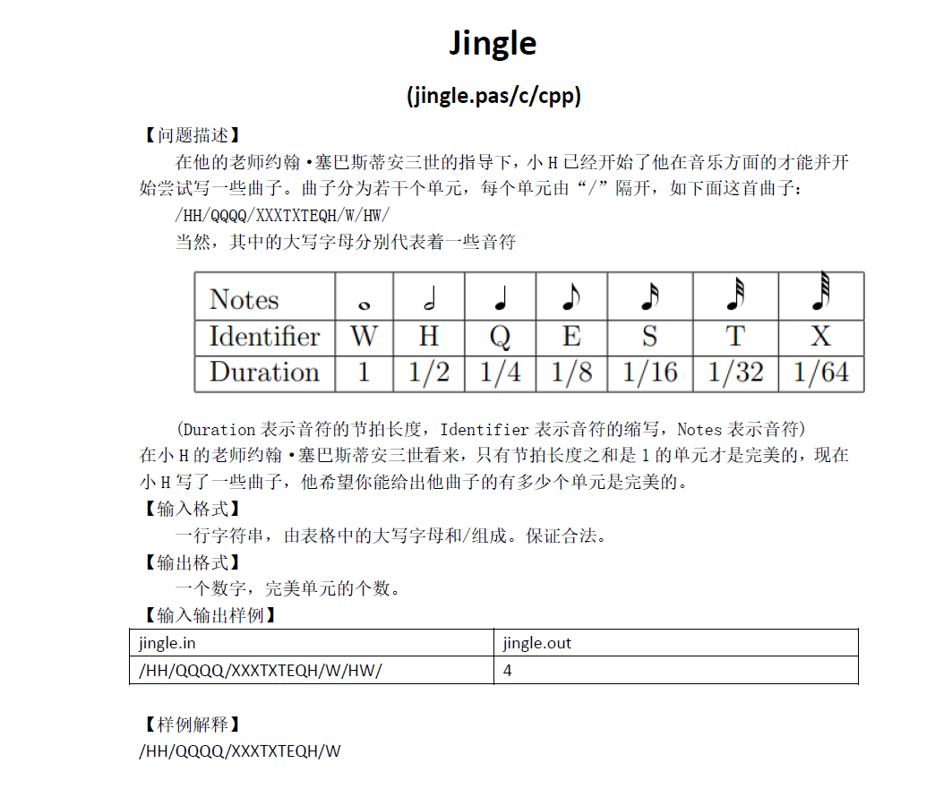 # include <bits/stdc++.h> using namespace std; const int MAXN=1e7+10; char s[MAXN]; int fun(char c) { if (c=='W') return 64;if (c=='H') return 32;if (c=='Q') return 16; if (c=='E') return 8; if (c=='S') return 4; if (c=='T') return 2; if (c=='X') return 1; } bool check(int l,int r) { int ret=0; for (int i=l;i<=r;i++) ret+=fun(s[i]); if (ret==64) return true; else return false; } int main() { freopen("jingle.in","r",stdin); freopen("jingle.out","w",stdout); cin>>s; int len=strlen(s); int cnt=0; for (int i=0;i<len;i++) if (s[i]=='/') cnt++; cnt--; int l=1,r,now=1; int ans=0; while(true) { for (r=l+1;r<=len;r++) if (s[r]=='/') break; r--; if (check(l,r)) ans++; l=r+2; if (now==cnt) break; now++; } printf("%d\n",ans); return 0; }