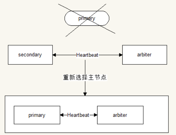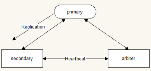 其中每个节点都是一个mongod进程对应的实例,节点之间互相周期性的通过心跳检查对方的状态,默认情况下primary节点负责数据的读、写,second节点备份primary节点上的数据(如何备份?下面会分析),但是arbiter节点不会从primary节点同步数据,从它的名字arbiter可以看出,它起到的作用只是当primary节点故障时,能够参与到复制集剩下的节点中,选择出一个新的primary节点,它自己永远不会变为primary节点,也不会参与数据的读写。也就是说,数据库的数据会存在primary和second节点中,second节点相当于一个备份,当然second节点可以有多个,当primary节点故障时,second节点有可能变为primary节点。典型流程如下图所示: