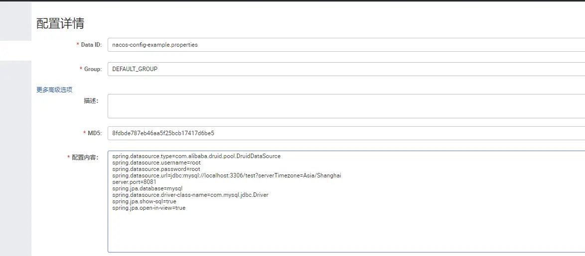 spring.application.name=nacos-config-example # 配置中心url spring.cloud.nacos.config.server-addr=127.0.0.1:8848