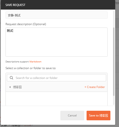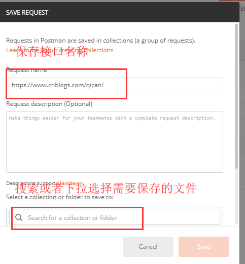 在Request name 修改保存的接口名称,下拉找到需要保存的文件夹,点击保存