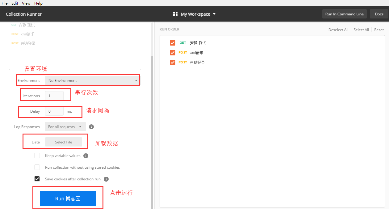 会发现重新弹出一个窗口,这里可以修改请求的间隔时间,也可以请求串行次数,环境场景,以及参数数据