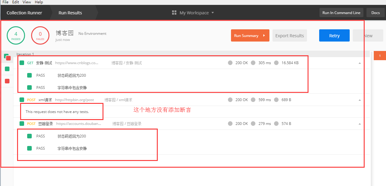点击运行后,我们可以看到请求的用例结果是否通过(用例是否请求成功和失败)