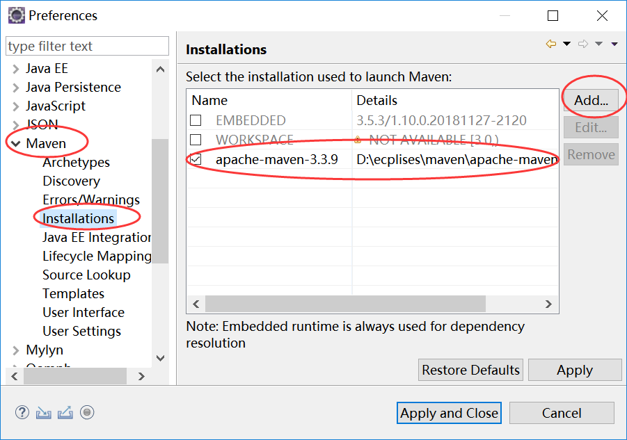 ecplise--->preperences下,点击add,添加进我们指定的maven版本,并将默认maven改为我们刚刚加入的maven,点击apply即可。