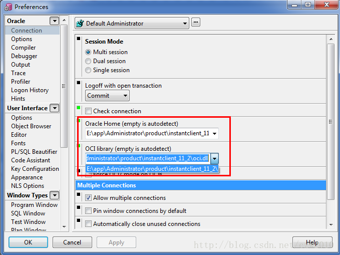 解压后打开PLSQL Developer,选择Tools -> perference -> Connection,配置其中的Oracle Home和OCI Library项