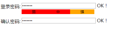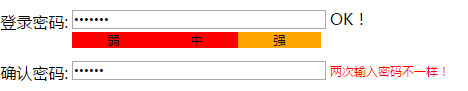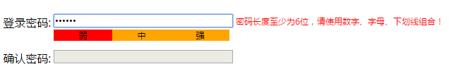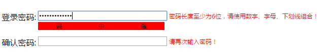 密码验证:要求1、密码长度至少为6位,请使用数字、字母、下划线组合!2、密码必须有数字和字母,不能纯数字或字母!3、密码长度大于6,且含有数字、字母时强度为中!4、密码长度大于12,且含有数字、字母时为强度为高!5、密码强度显示根据输入密码变化,密码强度为弱,确认密码不能进行操作;