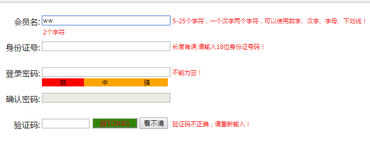 1 <body> 2 <table> 3 <tr> 4 <td><p>会员名:</p></td> 5 <td><input type="text" name="" id="Name" value="" required="required"/></td> 6 <td id="warn"></td> 7 </tr> 8 <tr> 9 <td><p>身份证号:</p></td> 10 <td><input type="text" name="" id="Idcard" value="" /></td> 11 <td id="warn2"></td> 12 </tr> 13 <tr> 14 <td><p>登录密码:</p></td> 15 <td><input type="password" name="" id="passWord" value="" /></td> 16 <td id="warn3"></td> 17 </tr> 18 <tr> 19 <td><p>确认密码:</p></td> 20 <td><input type="password" name="" id="ensure" value="" disabled="disabled"/></td> 21 <td id="warn4"></td> 22 </tr> 23 <tr id="login"> 24 <td><p>验证码:</p></td> 25 <td> 26 <input type="text" name="" id="write" value=""/> 27 <input type="button" name="" id="yan" value="" disabled="disabled"/> 28 <button id="faSong" onclick="pro();Color ()">看不清</button> 29 </td> 30 <td id="warn5"></td> 31 </tr> 32 </table> 33 <span id="ziFu"></span> 34 <span id="low">弱</span> 35 <span id="mid">中</span> 36 <span id="high">强</span> 37 </body>