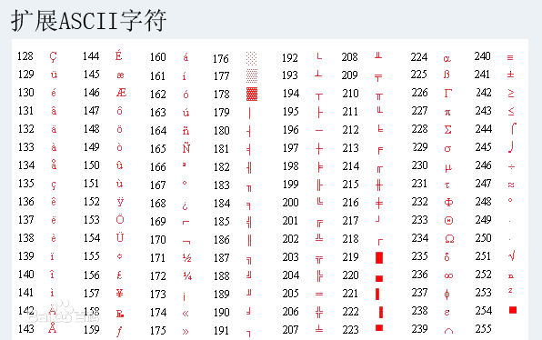 ASCII 是用来表示英文字符的一种编码规范。每个ASCII字符占用1 个字节,因此,ASCII 编码可以表示的最大字符数是255(00H—FFH)。这对于英文而言,是没有问题的,一般只什么用到前128个(00H--7FH,最高位为0)。而最高位为1 的另128 个字符(80H—FFH)被称为“扩展ASCII”,一般用来存放英文的制表符、部分音标字符等等的一些其它符号。