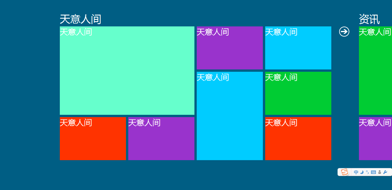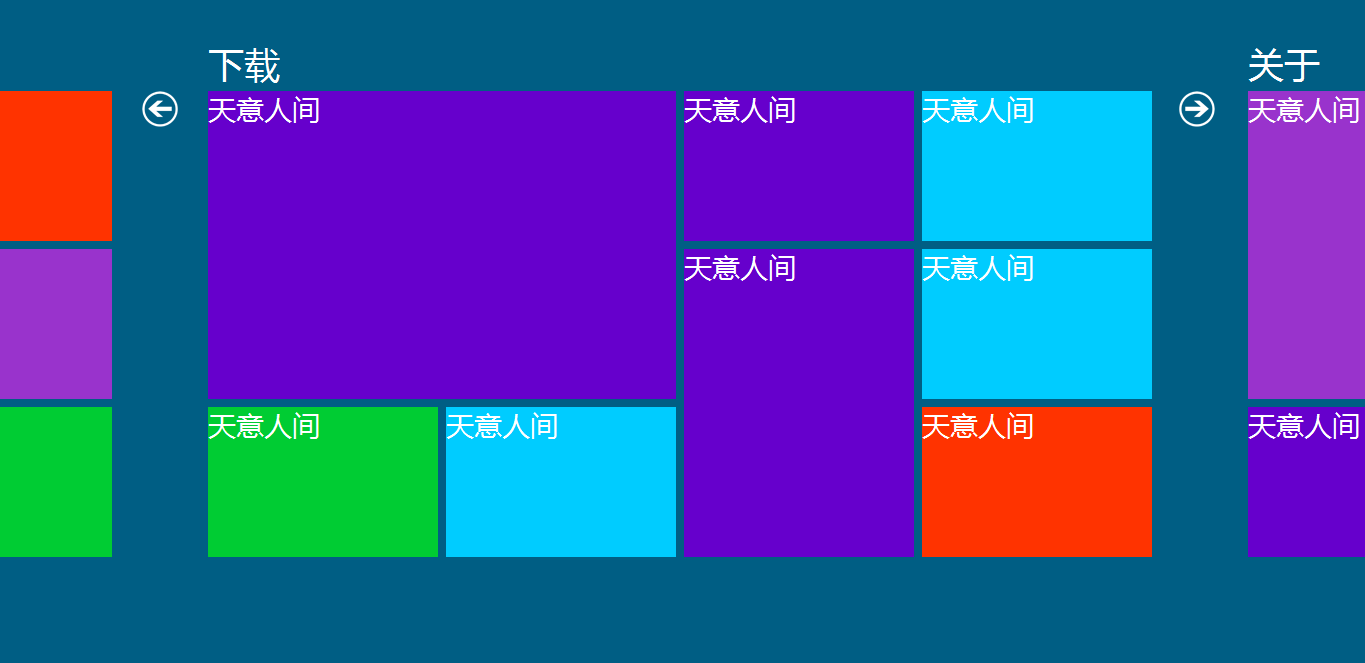 最近想把个人网站(天意人间)改版一下,准备用thinkphp,进入thinkphp网站,眼前一亮,改版了,改成win8的Metro界面了,效果确实相当的炫,所以我就想把我的博客也改成那样的界面。已经做出来界面和效果,可是由于忙、本人懒等原因,新版本被无限期推迟了。在这里把界面的源码发布出来。包括了鼠标滚动切换屏幕,点击切换按钮切换屏幕,还有就是颜色随机。脚本依然是mootools的,修改成jquery也相当简单。不过有一点遗憾,就是每一屏的最后两个元素是绝对定位的。