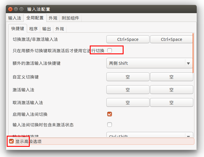 使用过程中有个习惯就是在任何窗口内只要按任意一侧的shift就可以激活输入法进行中英切换,但是貌似默认的配置是当你切换到另外一个窗口时不得不按组合键ctrl+space进行激活输入法然后在按shift进行中英切换,特别麻烦,后来仔细看了下fcitx的配置发现做上面的设置可以达到预期的目的~~