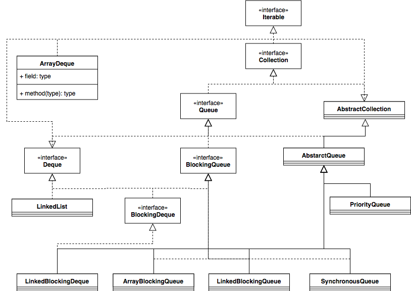 从继承类图中可以看出,队列主要分两种,一种是非阻塞队列,实现了Queue接口,包括LinkedList,ArrayDeque和PriorityQueue;一种是阻塞队列,实现了BlockingQueue,包括ArrayBlockingQueue,LinkedBlockingQueue,SynchronousQueue和LinkedBlockingDeque.