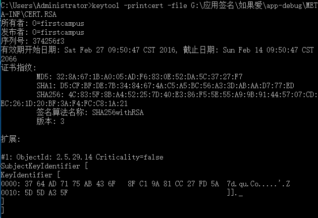 命令:keytool -printcert -file 目标文件路径