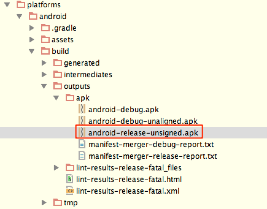 在执行这个命令之前,需要将config.xml的version号改成相应的,这个命令执行完之后,将会生成如图所示的一个android-release-unsigned.apk。这是未签名的apk,接下来如果你有一个签名秘钥可以跳过以下的步骤了,直接将得到的android-release-unsigned.apk和你的.keystory放在同一个目录下执行下面第4个命令就可以了。 如果没有执行下面的代码来获得一个。