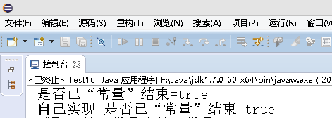 String str="字符串常量字符串常量"; //判断字符串结束 System.out.println(" 是否已“常量”结束="+str.endsWith("常量")); //查找法 System.out.println(" 自己实现 是否已“常量”结束="+(str.lastIndexOf("常量")==(str.length()-2)));