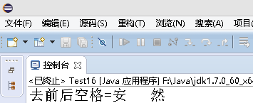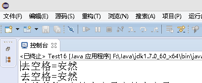 1 String str1=" 安 然 "; 2 3 System.out.println("去前后空格="+str1.trim());