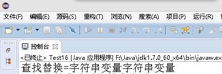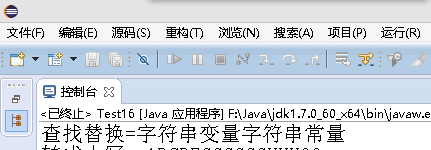 1 str="字符串常量字符串常量"; 2 3 System.out.println("查找替换="+str.replace("常量","变量")); 4 5 System.out.println("str="+str);