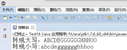 1 String str1="abcdeGGGGGGHHHOO"; 2 3 System.out.println("转成大写:"+str1.toUpperCase()); 4 5 System.out.println("转成小写:"+str1.toLowerCase());