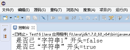 1 String str="字符串常量字符串常量"; 2 //判断字符串开始 3 4 System.out.println(" 是否已“字符串1”开头="+str.startsWith("字符串1")); 5 6 7 System.out.println(" 是否已“字符串”开头="+(str.indexOf("字符串")==0));