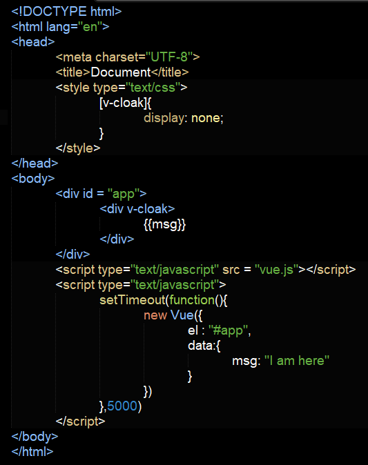 vue对象在5秒之后创建,使用v-cloak事件,当所有库加载完毕之后,v-cloak属性自动消失。信息则显示