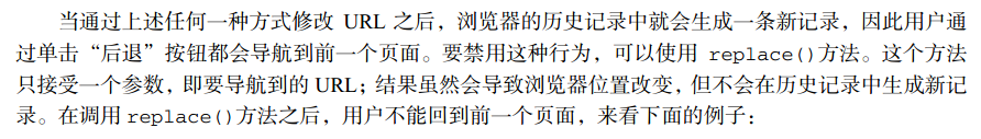 2. 替换history中当前url,实现禁止后退: location.replace("新url"),replace接受一个参数