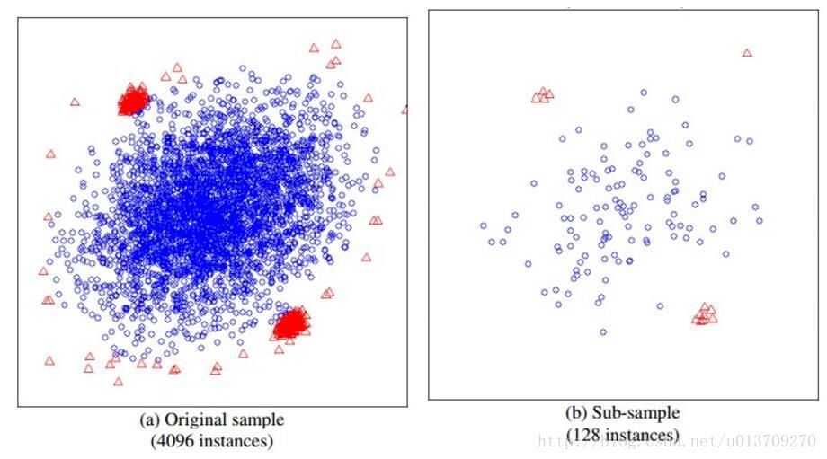 左边是原始数据,右边是采样了数据,蓝色是正常样本,红色是异常样本。可以看到,在采样之前,正常样本和异常样本出现重叠,因此很难分开,但我们采样之和,异常样本和正常样本可以明显的分开。