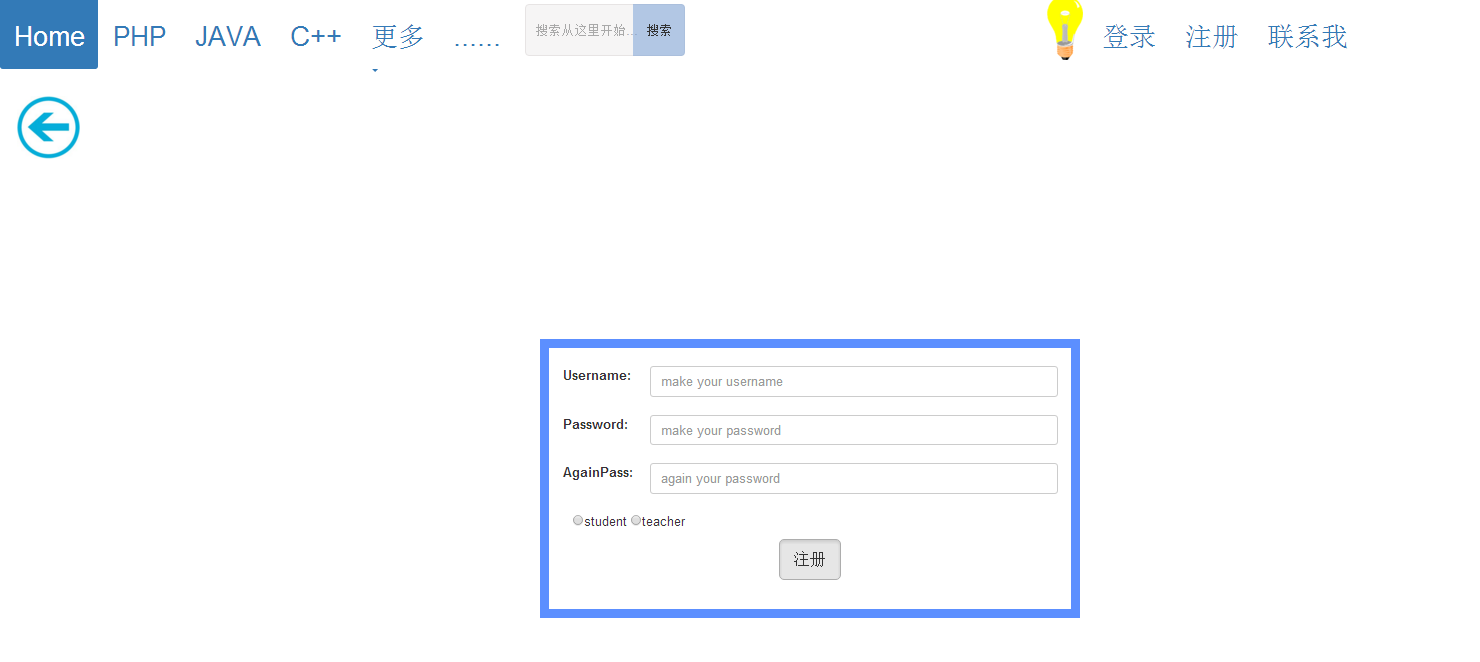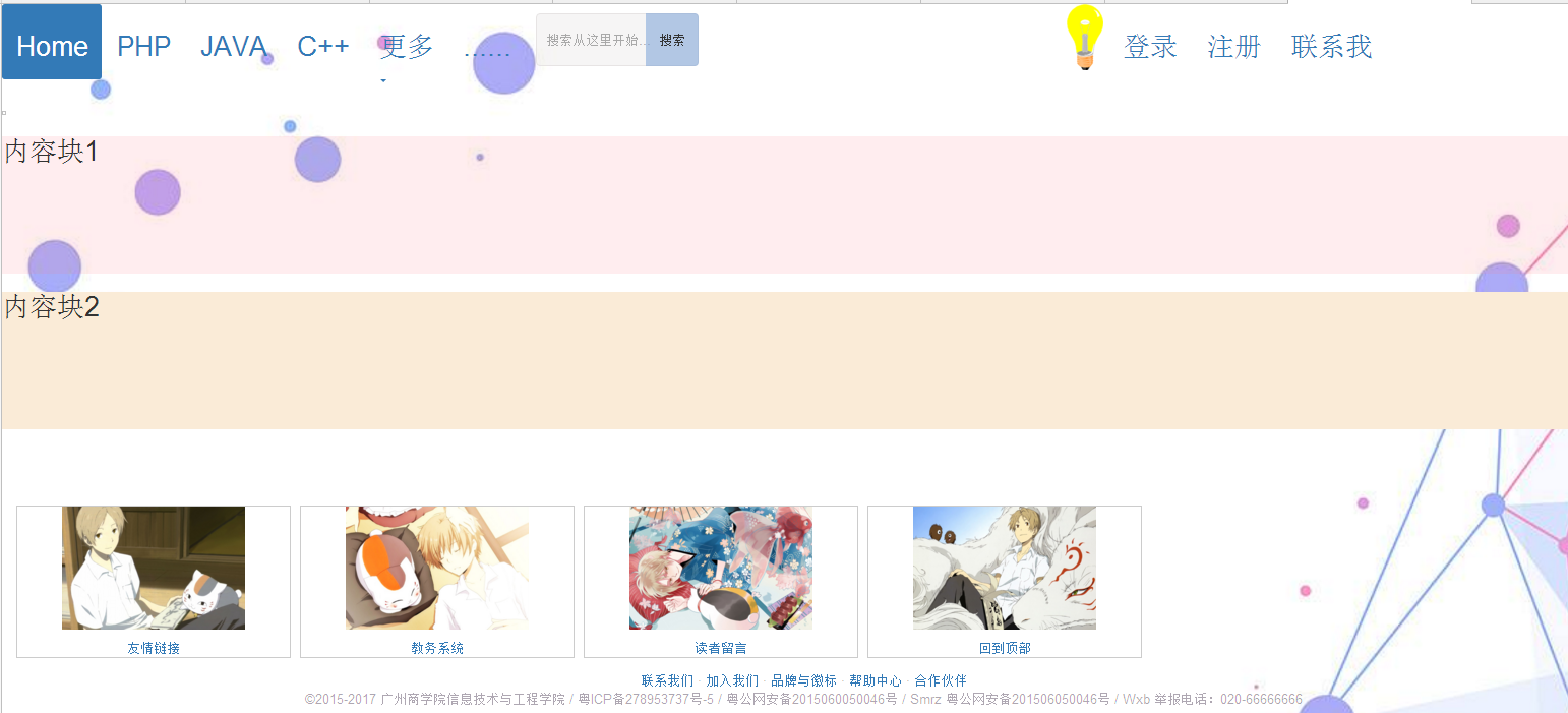 <!DOCTYPE html> <html> <head> <meta charset="utf-8"> <title></title> <script language="javascript" type="text/javascript" src="{{url_for('static',filename="js/basic.js") }}"></script> <link rel="stylesheet" type="text/css" href="{{url_for('static',filename="css/basic.css") }}"> <link rel="stylesheet" href="http://cdn.static.runoob.com/libs/bootstrap/3.3.7/css/bootstrap.min.css"> <script src="http://cdn.static.runoob.com/libs/jquery/2.1.1/jquery.min.js"></script> <script src="http://cdn.static.runoob.com/libs/bootstrap/3.3.7/js/bootstrap.min.js"></script> </head> <body id="myBody" background="{{url_for('static',filename="img/timg1.jpg") }}"> <ul class="nav nav-pills"> <li class="active"><a href="{{ url_for('index') }}"><h2>Home</h2></a></li> <li><a href="#"><h2>PHP</h2></a></li> <li><a href="#"><h2>JAVA</h2></a></li> <li><a href="#"><h2>C++</h2></a></li> <li class="dropdown"> <a class="dropdown-toggle" data-toggle="dropdown" href="#"> <h2>更多</h2><span class="caret"></span> </a> <ul class="dropdown-menu"> <li><a href="#"><h2>python</h2></a></li> <li><a href="#"><h2>html</h2></a></li> <li><a href="#"><h2>jsp</h2></a></li> </ul> </li> <li><a href="#"><h2>...... </h2></a></li> <li> <input class="d1" type="text" placeholder="搜索从这里开始..."> <button class="b" type="submit">搜索</button></li> <li><img id="myOnOff" onclick="mySwitch()" src="http://www.runoob.com/images/pic_bulbon.gif" width="40px"> </li> <li><a href="{{ url_for('login') }}"><h2>登录</h2></a></li> <li><a href="{{ url_for('zhuce') }}"><h2>注册</h2></a></li> <li><a href="#"><h2>联系我</h2></a></li> </ul> <img id="gui" onclick="mySwitch()" src="" width="1700px"> <div class="kuai"> <div class="n1"> <h2>内容块1</h2> </div > <div class="n2"> <h2>内容块2</h2> </div> </div> <div id="didao"> <div class="img"><a href="http://www.baidu.com"><img src="http://scimg.jb51.net/allimg/140408/10-14040QG01GU.jpg"></a><div class="desc"></div><a href="http://www.baidu.com">友情链接</a></div> <div class="img"><a href="http://www.baidu.com"><img src="http://imgstore.cdn.sogou.com/app/a/100540002/800197.jpg"></a><div class="desc"></div><a href="http://www.baidu.com">教务系统</a></div> <div class="img"><a href="http://www.baidu.com"><img src="http://4493bz.1985t.com/uploads/allimg/150625/1-1506251F320.jpg"></a><div class="desc"></div><a href="http://www.baidu.com">读者留言</a></div> <div class="img"><a href="http://www.baidu.com"><img src="https://timgsa.baidu.com/timg?image&quality=80&size=b9999_10000&sec=1510223061&di=bc9ea322068f5f0311fb2ab6fe9db29a&imgtype=jpg&er=1&src=http%3A%2F%2Fwww.005.tv%2Fuploads%2Fallimg%2F160920%2F103J12649-15.jpg"></a><div class="desc"></div><a href="http://www.baidu.com">回到顶部</a></div> </div> <footer> <div class="foot"> <div > <a href="#"> 联系我们</a> · <a href="#"> 加入我们</a> · <a href="#"> 品牌与徽标 </a> · <a href="#">帮助中心</a> · <a href="#">合作伙伴</a></div> <div>©2015-2017 广州商学院信息技术与工程学院 / 粤ICP备278953737号-5 / 粤公网安备2015060050046号 / Smrz 粤公网安备201506050046号 / Wxb 举报电话:020-66666666</div> </div> </footer> </body> </html>