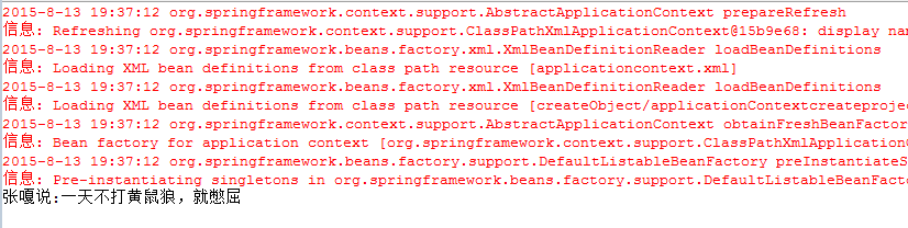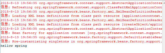 package createObject; import org.springframework.context.ApplicationContext; import org.springframework.context.support.ClassPathXmlApplicationContext; public class texthell{ public static void main(String[] args) { // TODO Auto-generated method stub //加载配置文件 ApplicationContext context=new ClassPathXmlApplicationContext("applicationcontext.xml"); HelloWord te=(HelloWord) context.getBean("create"); te.hellow(); } }