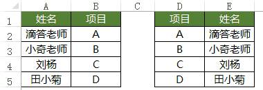 操作:选中D1:E5单元格区域,输入公式:=IF({1,0},B1:B5,A1:A5),按下ctrl+shift+回车,完成多单元格公式输入。
