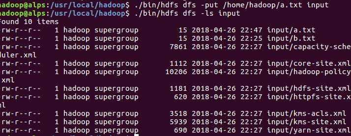 4.使用命令把本地文件系统中的“txt”上传到HDFS中的当前用户目录的input目录下。