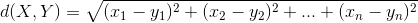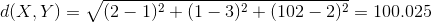 标量也就是无方向意义的数字,也叫标度变量。现在先考虑元素的所有特征属性都是标量的情况。例如,计算X={2,1,102}和Y={1,3,2}的相异度。一种很自然的想法是用两者的欧几里得距离来作为相异度,欧几里得距离的定义如下: