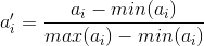 下面要说一下标量的规格化问题。上面这样计算相异度的方式有一点问题,就是取值范围大的属性对距离的影响高于取值范围小的属性。例如上述例子中第三个属性的取值跨度远大于前两个,这样不利于真实反映真实的相异度,为了解决这个问题,一般要对属性值进行规格化。所谓规格化就是将各个属性值按比例映射到相同的取值区间,这样是为了平衡各个属性对距离的影响。通常将各个属性均映射到[0,1]区间,映射公式为: