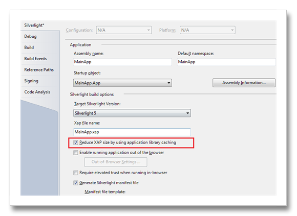 此时,打开MainApp工程属性页面,勾选"Reduce XAP size by using application libary caching"