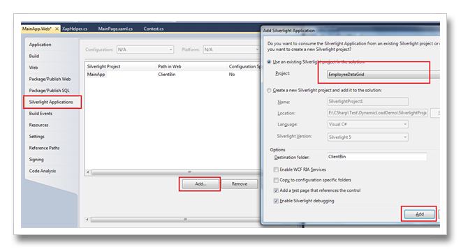 有了对Xap包结构和AppMainfest.xaml 结构的初步认识之后,要实现Xap包的动态加载就比较容易了。新建一个Silverlight应用程序EmployeeDataGrid,添加一些逻辑代码和引用。之后再将工程添加到MainApp.Web工程的Silverlight Application中。