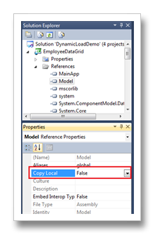 发现,MainApp.xap中已经有的MainApp.dll和Model.dll在EmployeeDataGrid.xap中重复存在了,比较不爽。有人会说只要在发布之前手动删除EmployeeDataGrid.xap中重复的dll就可以了。虽然这样是可行的,但是无疑带来了很多无谓的工作量。其实有一种非常简单的方法可以解决这一问题。只要设置EmployeeDataGrid引用工程中那些重复引用程序集的Copy Local属性为Fasle,再重新编译一下,这次生成xap包时就不会讲这些程序集压缩进去。