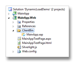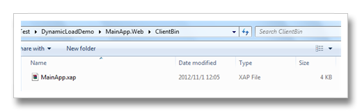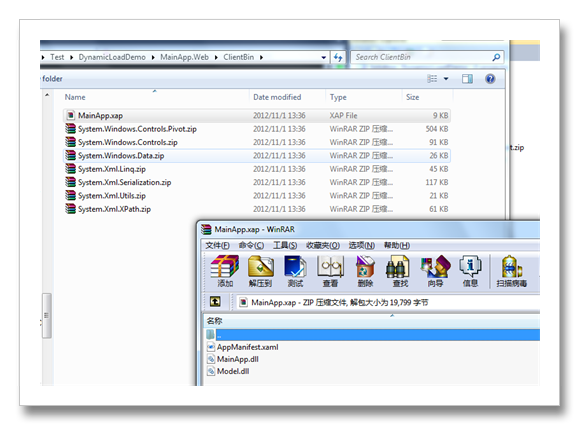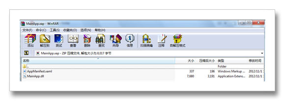使用VS新建一个名为MainApp的Silverlight应用程序,使用默认设置生成一个对应的MainApp.Web工程。完成编译,这时会在对应的Web工程的ClienBin目录下生成MainApp.xap文件(实际上是一个zip包)