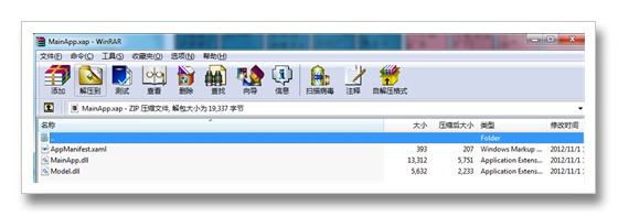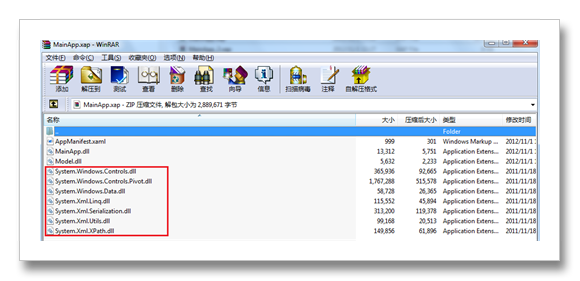 仔细观察的话,会发现原来xap包中引用的外部dll和新生成的zip文件一一对应。而此时的AppMainfest.xaml 也发生了变化: